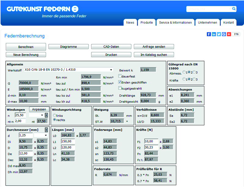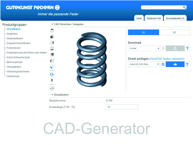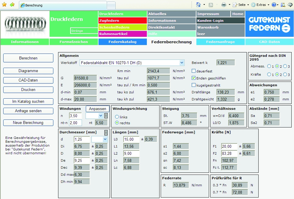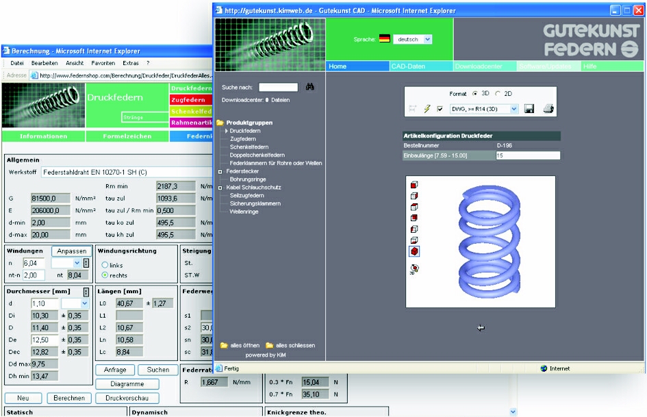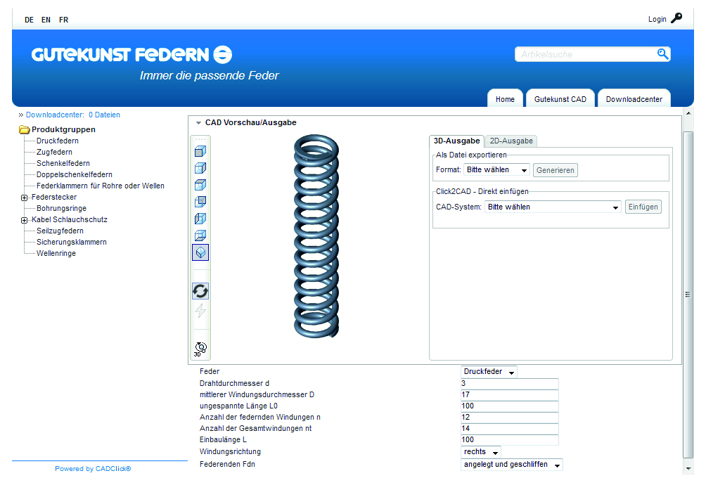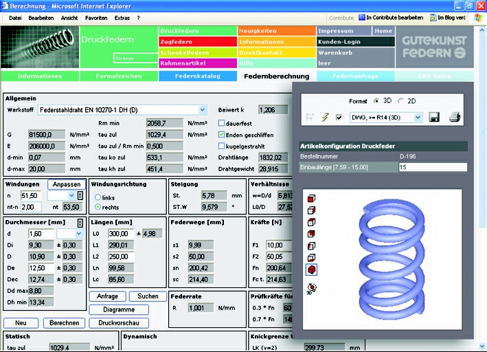 ScreenshotFedernberechnung online mit Auswahlmenü (CAD-Daten, Katalogsuche, Anfrage etc.) |